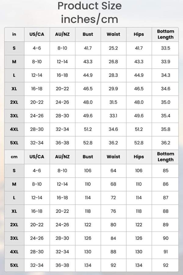 | Size | US/CA | AU/NZ | Bust | Waist | Hips | Pants Length |