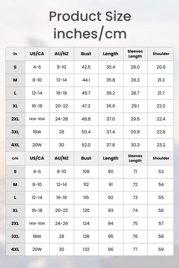 | inches | US/CA | AU/NZ | Bust | Length | Sleeves | Shoulder |