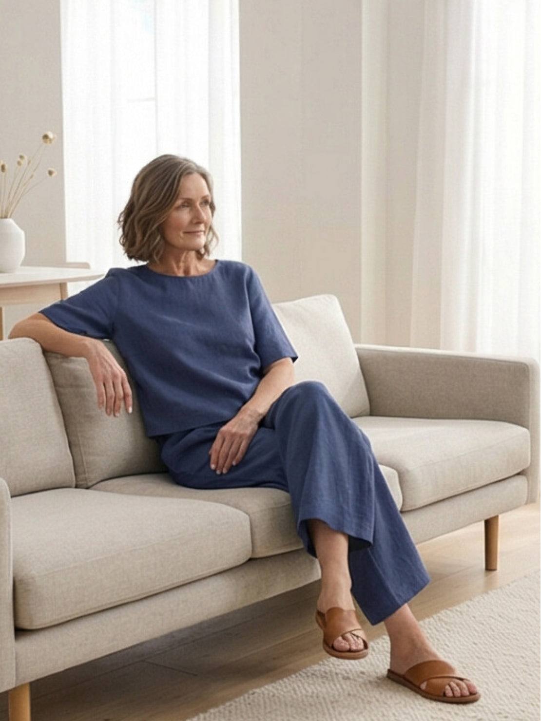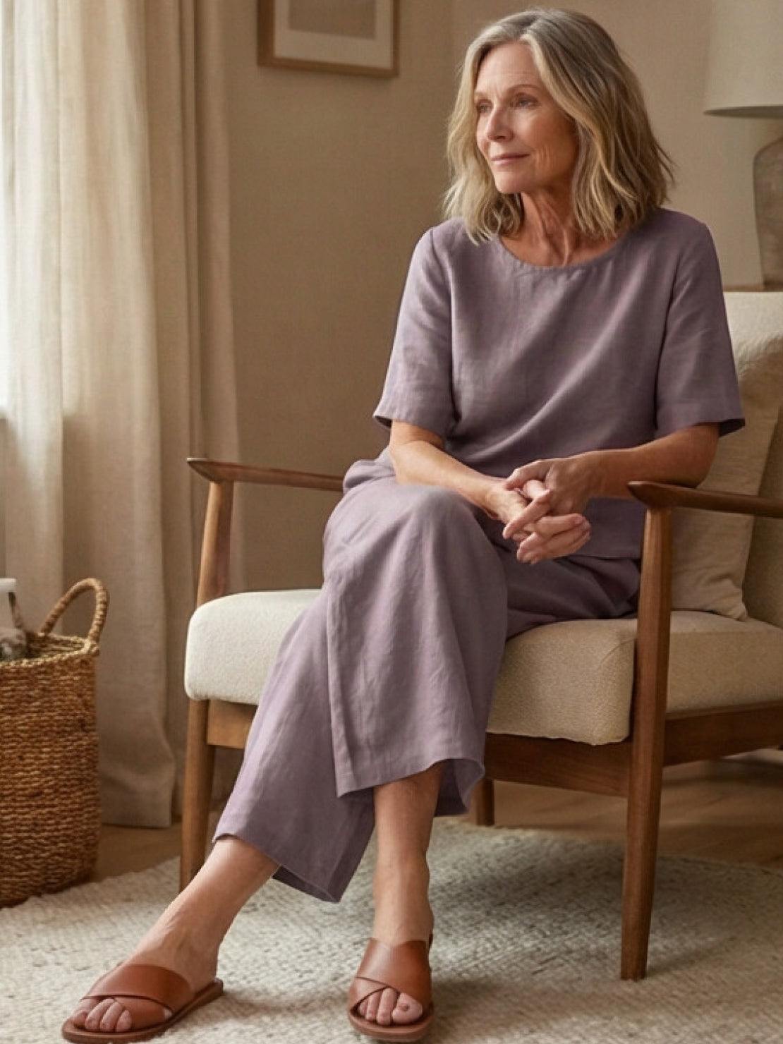 - Wide-Leg Bottoms: Gently flowing, full-length trousers with an easy elastic waistband.